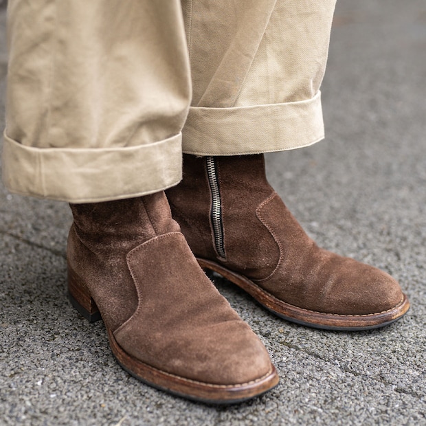 足元はブラウンスウェードのブーツが温かみを演出。 目を引くカットやソールのデザインは『メゾンマルジェラ』ならでは。