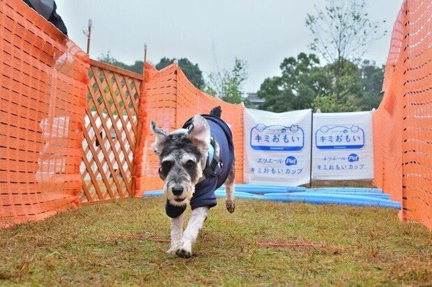 「エリエールPet キミおもいカップ」は、パンツタイプのおむつ『アクティブウェア』を着用して参加するミニトラップレース。ミニハードルやスラロームを設置し、タイムを計測しました。上手にスラロームをクリアする愛犬たちや、アクティブウェアを着用しながら元気よく走る姿に、温かい声援が送られました!