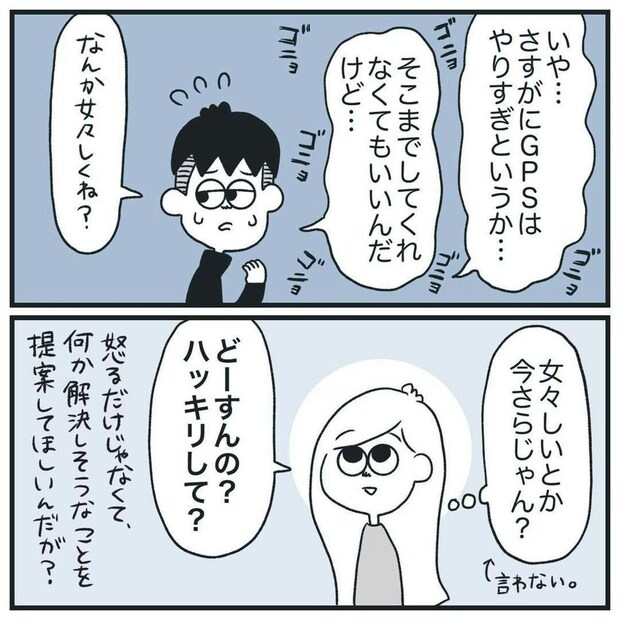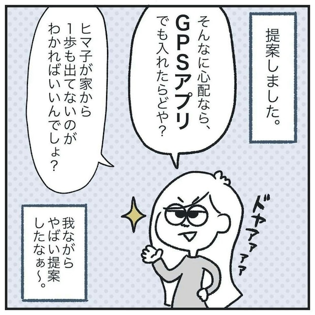 GPSの提案をしました。ヒマ子さんは、真面目に話しつつも、やりすぎだと感じています。それは、彼氏も同意見だったようで、GPSの件は保留に。