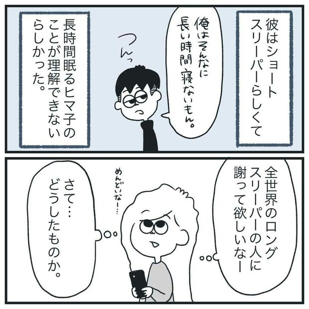 ロングスリーパーのヒマ子さんにとって、たっぷり睡眠をとるのは珍しくありません。ですが、ショートスリーパーの彼氏にとって、「寝てた」は、信じられないようです…。