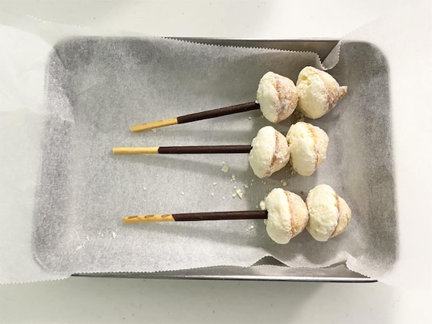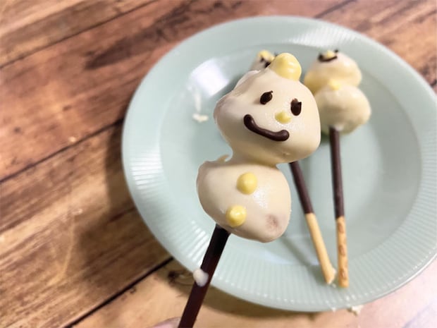 3.ポッキーに挿した鈴カステラを溶かしたホワイトチョコレートでコーティング。冷蔵庫で固まるまで冷やす。