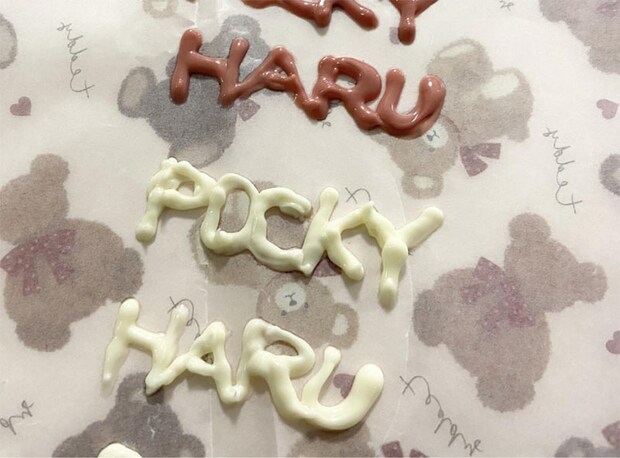 2.文字が固まったら、チョコペンの残りをのり代わりに使ってポッキーと文字をくっつける。冷蔵庫で固まるまで冷やしたら完成!
