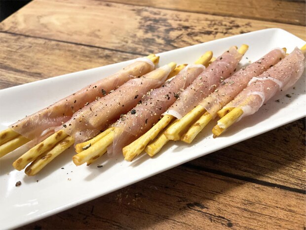 1.プリッツ3~4本に生ハムを巻き付ける。