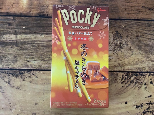 「冬のきらめきポッキー 塩キャラメル」は焦がしバターをチョコレートとプレッツェルに練り込んだ黄金バター仕立て。塩とキャラメルの奥深い味わいが楽しめるポッキー。