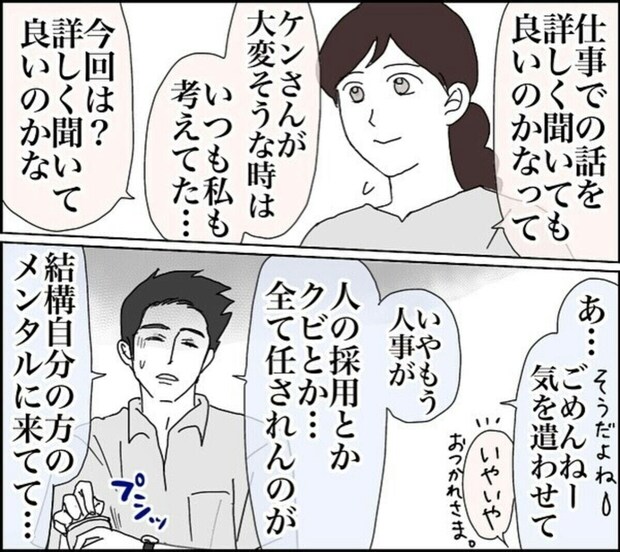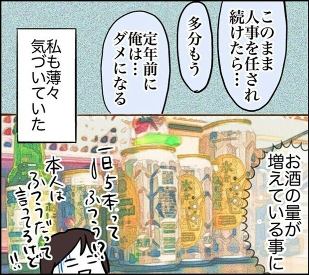 まずは夫に、仕事を辞めたい理由を聞いたふくこさん。ふくこさんが想像していた通り、仕事の疲れが原因だったようです。お酒の量が増えている状況は心配ですね。