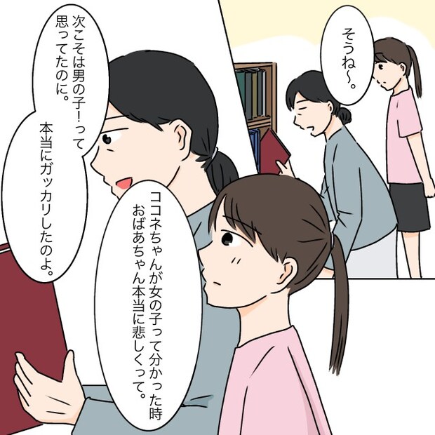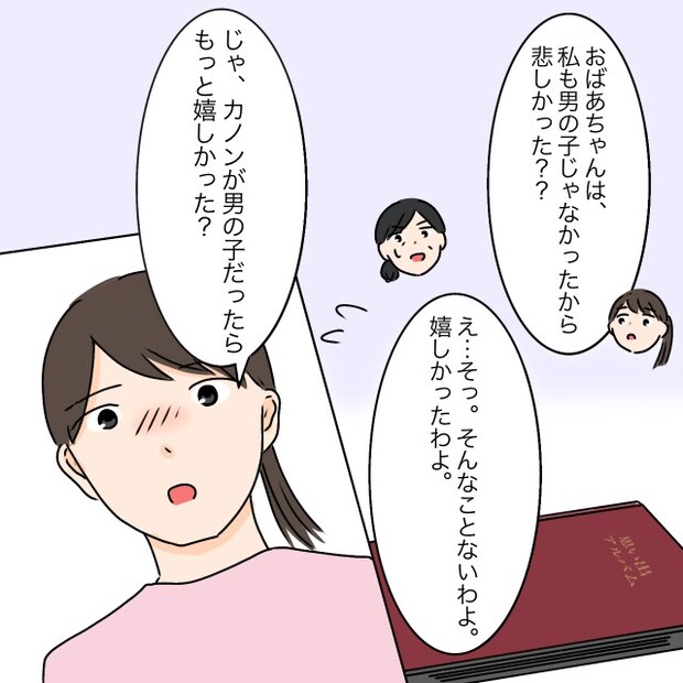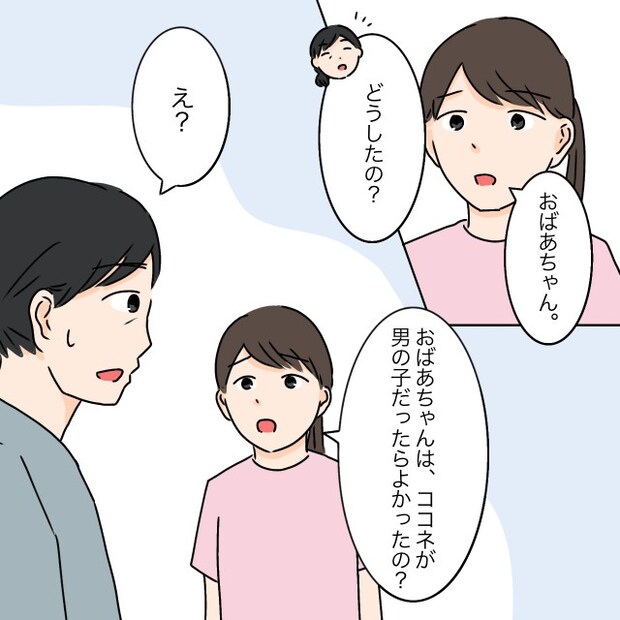 井戸端会議を終え、家の中に戻ってきた義母。カノンはすかさず「おばあちゃんは、ココネが男の子だったらよかったの?」と問いかけます。急な質問に義母は「え?」と驚きます。