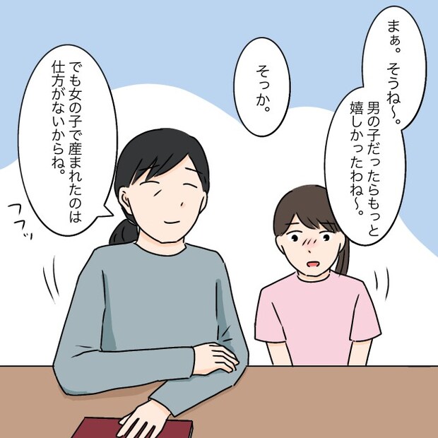義実家に遊びに来たカノンが廊下を歩いていると、玄関先から義母と近所のおばさんの話し声が聞こえてきました。耳を澄ませると、どうやら自分の母のことを話している様子。「結局男の子産まずじまい、2人目も女の子だった時のがっかり、わかる?」と嫌味たっぷりに話す義母。やっぱり男の子は欲しかったわよね~と残念がる姿を見て、今まで自分のことを可愛がってくれていた義母が、本当は男の子の孫が欲しかったんだと知り、ショックを受けます。