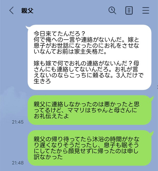 しかし義父から、旦那に突然怒りのLINEが届いており、なんで義父にお礼の一言や連絡が無いのか、嫁と息子がお世話になったのにお礼をさせないなんて家主として失格だ、第一嫁さんもなんでお礼の連絡がない?義母にも連絡してないだろ、頼るにしてもお礼の言葉言えないのなら3人だけで生きろ的な文面がいきなり来ました。