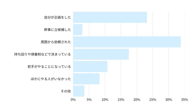 最多回答の「周囲から依頼された(33.8%)」や、「持ち回りや順番制(17.5%)」、「若手がやる慣例(10.8%)」の理由が約60%を占め、幹事は周囲からの依頼や組織の慣例によって選ばれることが多いと言える。「ほかにやる人がいなかった(8.3%)」といった回答もあり、やむを得ず幹事を引き受けているケースも少なくなさそう。