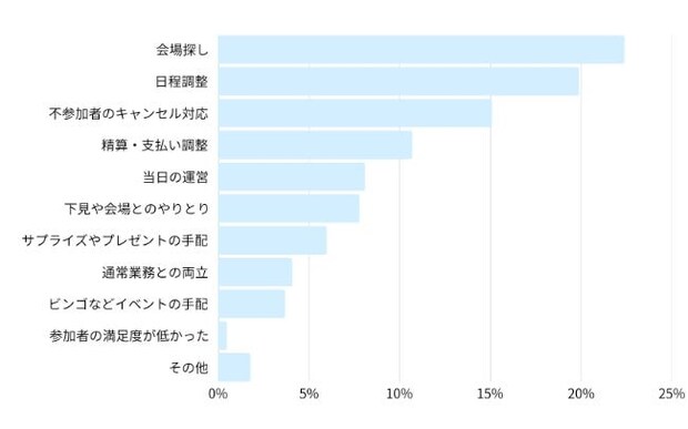 大人数が収容可能な「会場探し(22.4%)」、まず最初に行うべき「日程調整(19.9%)」、急な不参加者の「キャンセル対応(15.1%)」と、宴会当日までの調整が大変だった仕事の上位を占めた。