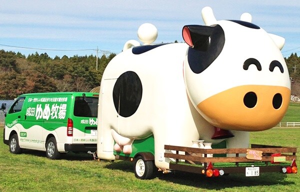 牛のキャラクターが可愛い「成田ゆめ牧場」のキッチンカーでは、自家製ジェラートや肉巻きおにぎりなどを用意。