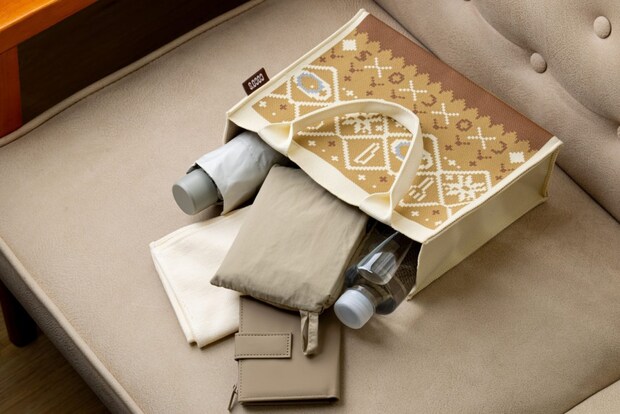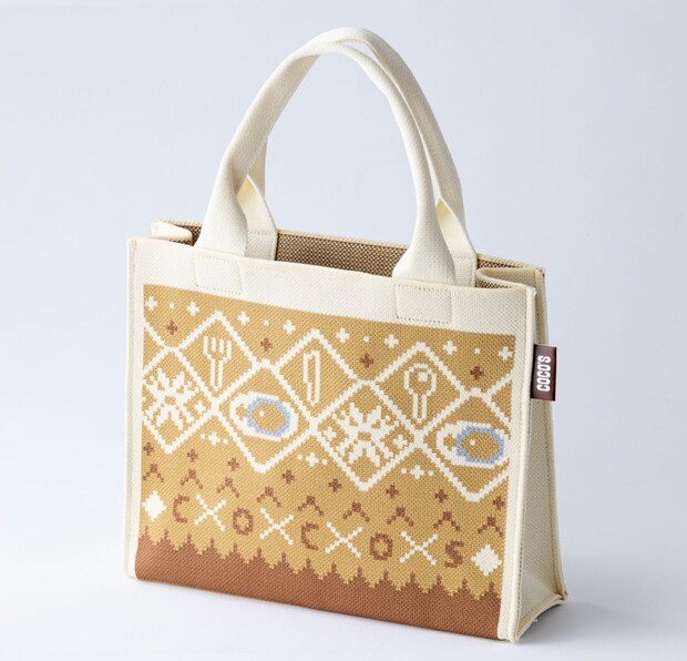 包み焼きハンバーグ、ナイフ、スプーン、フォークをモチーフにしたデザイン。冬のコーディネートに馴染むブラウン基調で、500mlボトルも入る実用的なサイズ。厚手の生地で自立し、お出かけにも便利。