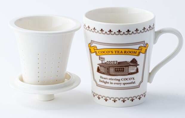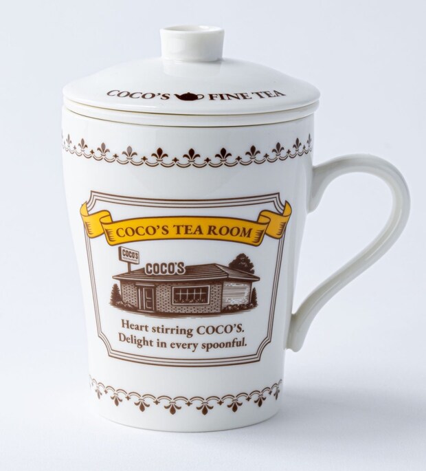 ココスの店舗がイラストで描かれた陶磁器マグカップ。茶こしとフタ付きで、本格的な紅茶を手軽に楽しめる。茶こしは取り外し可能で手入れも簡単。