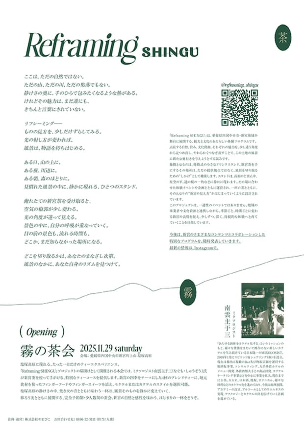 霧の茶会は、地域の新たな価値を引き出し発信する「Reframing SHINGU」プロジェクトの第1弾。