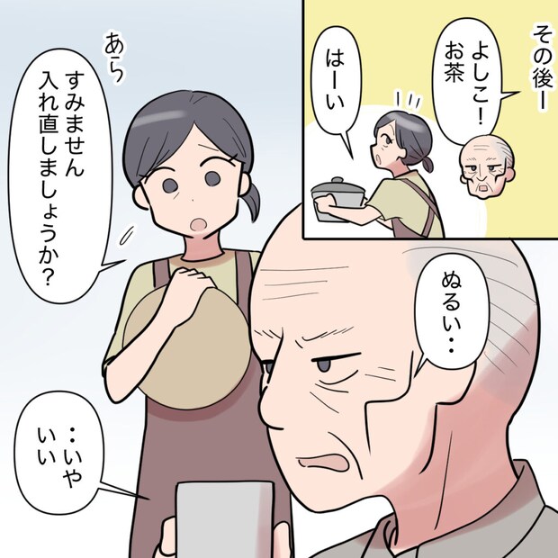 「よしこ!お茶」いつものように義祖父に言われてお茶を淹れると「ぬるい」とひと言。ここまでがセット。「すみません淹れなおしましょうか」とよしこさんが言うと、これまでなら当然のようにそうさせていた義祖父は、しばらく考えてから「・・・いや、いい。」と言うようになりました。