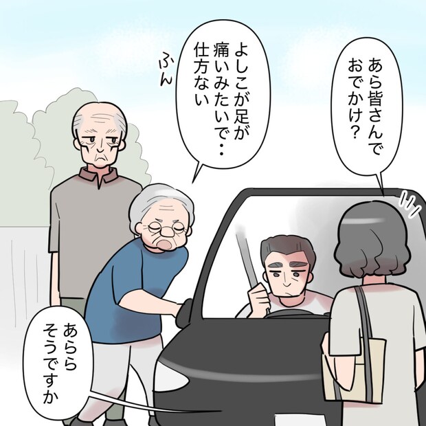 義父が運転する車に珍しく義祖父母が乗り込むのを見かけたご近所さんが「あら皆さんでおでかけ?」と声をかけました。義祖母は「よしこが足が痛いみたいで・・・仕方ない。」ふん、とした態度ですが、今までとは明らかに柔和な態度です。「あらら。そうですか」とご近所さんも見送りました。