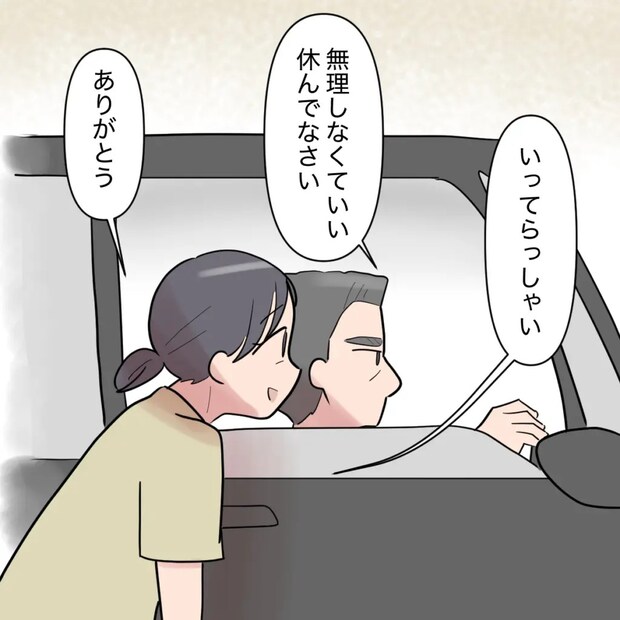 義父は、「無理しなくていい。休んでなさい。」とぼそり。よしこさんは笑顔で「ありがとう」と言って3人を見送りました。