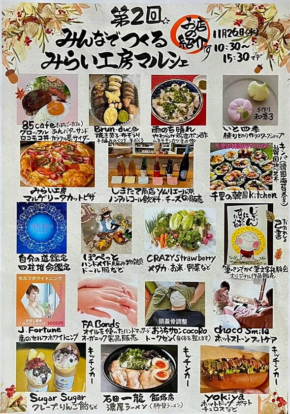 さらに、ハンドメイド雑貨、マッサージ、四柱推命鑑定など、筑豊を中心とした18店舗が参加します。