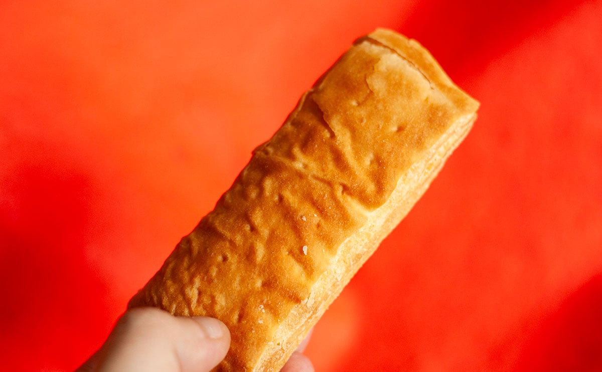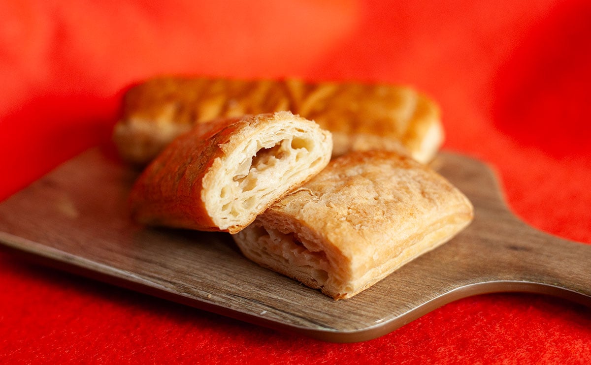 観察していたとき、生地が厚いことをそんなに気にしていなかったのですが、食べているときにめちゃめちゃ気になりますね。というのも、パイというよりデニッシュで、サクサク感はほとんどありません。リベイクして、ようやく表面が少し……というくらいで、はっきり言って残念でした。