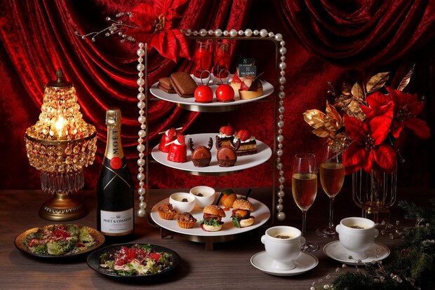 【関連写真】「ルビーエレガンス クリスマスアフタヌーンティー」他イメージ3枚今回は、真っ赤なイチゴと濃厚なショコラのマリアージュを主役に、欧州スタイルのエレガンスクリスマスをイメージ。ティースタンドには、パールやポインセチアを飾り、より華やかな雰囲気に仕上げた。