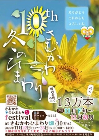 寒川神社南側の「さむかわひまわり畑」では、約3000㎡に約10万本のひまわりが咲き誇る。同会場で開催する「さむかわ冬のひまわりfestival」では、特設の見晴台からの眺望、記念撮影スポット、ひまわりの摘み取り体験を楽しめるほか、地場野菜やお土産等の販売を予定しているという。
