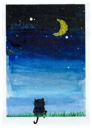 2023年に金賞に選ばれた『しあわせだね』は、寒い冬の夜、月を見上げる親子の猫を描いたもの。月の光に包まれた子猫が感じたぬくもり、それが「しあわせだね」という一言に変わった。