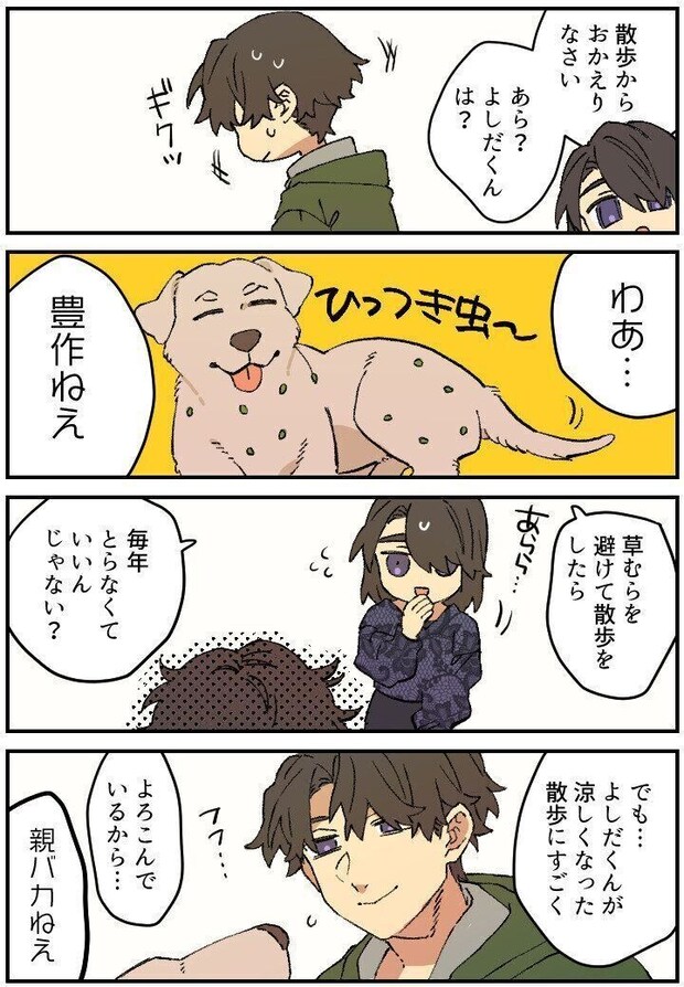 2025年11月13日 連載漫画【暮瀬姉弟と吉田くん】第三百六十三「吉田くんに今年も」 いぬのきもち WEB MAGAZINE 吉田くんと散歩に行っていた周一が帰宅。今日のふりかえり:今年もひっつき虫を大量にくっつけた吉田くん!涼しくなった秋の散歩にテンション上がっちゃったみたい。散歩、楽しかったね!