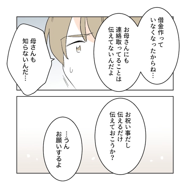 両親が離婚した後、母親と暮らしていたショウタさんは父親の所在も連絡先も知らないまま長年過ごしてきましたが、父方のおばあちゃんが父親の電話番号を知っていて年に数回連絡を取っていたと聞いて驚きます。おばあちゃんから結婚の報告をお父さんにするか聞かれたショウタさんは、迷いながらも伝えてもらうことに。すると、数日後におばあちゃんから、お父さんがお祝いしたいから会いたいと言っていると連絡をもらいます。無理はしなくていいとおばあちゃんは言ってくれましたが、ショウタさんは記憶にもあまり残っていないお父さんと会うことを決意します。