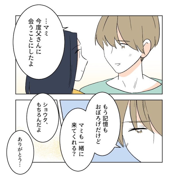 電話を切ったショウタは、「・・マミ、今度父さんに会うことにしたよ」と不安と嬉しさが入り混じったような表情で私に言いました。そして「もう記憶もおぼろげだけど、マミも一緒に来てくれる?」と聞くショウタを見て一人では心細いのだろうと感じた私。「ショウタ、もちろんだよ」と答えると、ショウタはホッとしたように「ありがとう・・」と静かに言いました。