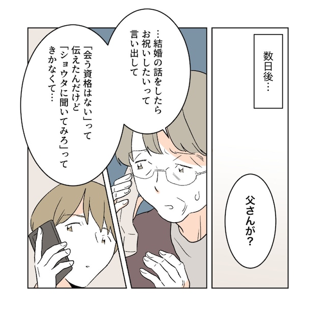 結婚式の準備中のショウタさんとマミさん。二人とも両親が離婚しており、マミさん側は母親と姉、ショウタさん側は母親と妹だけを式に招待し、お互いに父親は呼ばないことにしました。父親の所在も連絡先も知らないというショウタさんですが、父方のおばあちゃんとは仲良くしており、マミさんと一緒に結婚の挨拶に行くことに。おばあちゃんはショウタさんからの結婚報告を嬉しそうに聞いていましたが、突然真顔になると「お父さんに報告するかい?」と聞きました。