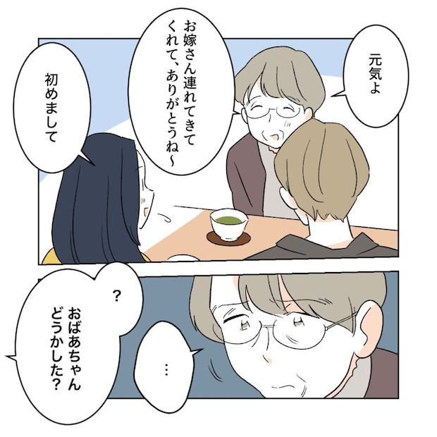 「元気よ。お嫁さん連れてきてくれて、ありがとうね~」と朗らかに笑うおばあちゃんに「初めまして」と緊張気味に挨拶をした私。すると、さっきまでニコニコしていたおばあちゃんの顔が曇り、何か考え込むように黙り込んでしまいました。「おばあちゃん、どうかした?」ショウタが心配そうに聞くと、