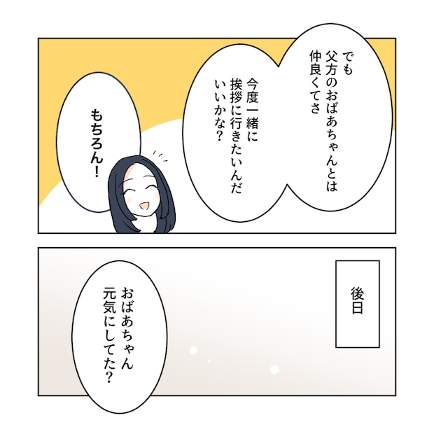 すると、「でも、父方のおばあちゃんとは仲良くてさ。今度一緒に挨拶に行きたいんだ。いいかな?」とショウタが言うので「もちろん!」と答えました。後日、私たちはショウタの父方のおばあちゃんの家を訪れました。「おばあちゃん、元気にしてた?」ショウタが声をかけると、