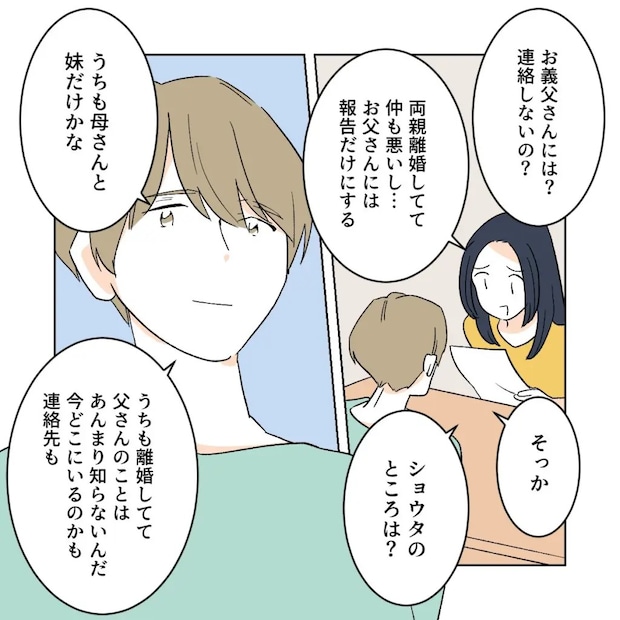 結婚式の準備中のショウタさんとマミさん。二人とも両親が離婚しており、マミさん側は母親と姉、ショウタさん側は母親と妹だけを式に招待し、お互いに父親は式に呼ばないことにしました。ショウタさんは父親の連絡先もどこにいるのかも知らないものの、父方の祖母とは仲が良く、二人で結婚の報告をしに行くことに。ショウタさんからの結婚の報告を嬉しそうに聞いていたおばあちゃんは、急に黙り込んだあと「お父さんに報告はするのかい?」と神妙な面持ちでショウタさんに聞きました。