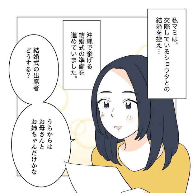 私マミは、交際しているショウタとの結婚を控え、沖縄で挙げる結婚式の準備中です。今日は式の出席者について話し合うことに。私が「結婚式の出席者どうする?うちからはお母さんとお姉ちゃんだけかな」と言うと、