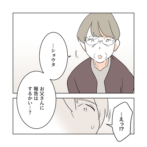 おばあちゃんは言いにくそうに口を開き「・・ショウタ、お父さんに報告はするかい・・?」と神妙な面持ちで聞きました。おばあちゃんの予想外の言葉にショウタは「・・えっ!?」ととても驚いていました。