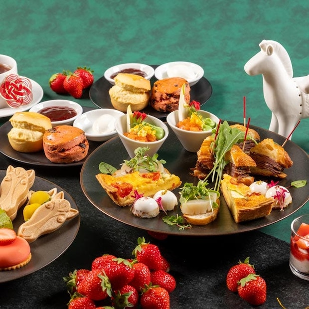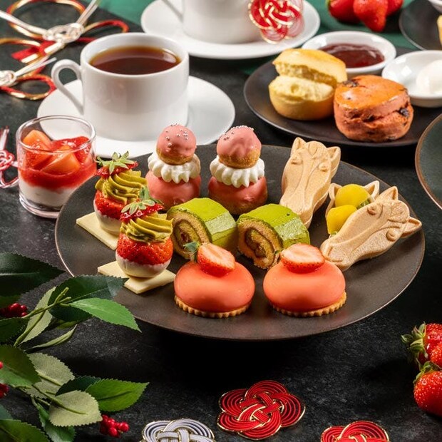 セイボリーは、10層に重ねたホテルメイドのビーフパストラミが挟まれた、バターが香る自家製クロワッサンサンドをはじめ、金箔で新年の華やかさを演出した「モッツァレラチーズムース」や、桜チップで約8時間燻された自家製スモークサーモンと、まろやかなブロッコリーピューレを合わせたタルタルなどが用意される。