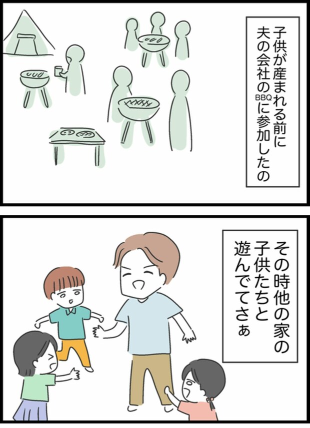 今は何でもやってもらって当たり前、子どもとの遊びもろくにしない夫しょうたですが、過去に参加した会社のBBQでは、いろいろなことに気を配りながら子どもたちと遊んでいたようです。そんな過去もあるので…。