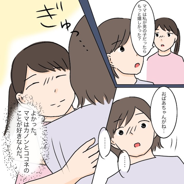男の子至上主義の義母がいる家に嫁いだトモコさん。結婚の挨拶の時からトモコさんが長女であることが気に入らなかったり、男の子でなく女の子が生まれたことにあからさまにがっかりして「この結婚は失敗だった」と男尊女卑の価値観を振りかざす義母にトモコさんは疲弊していくものの、角が立つことを気にして、義母に物申してくれる夫を止めてばかりいました。ところが次女ココネちゃんが産まれたばかりのころ、家に押しかけてまで「また女の子」「ちゃんと産み分けしたの?」「罰が当たった」などと非常識で心無いことを言う義母に、とうとうトモコさんにも我慢の限界がきて義母に物申し、追い返したのでした。それ以降、トモコさんは義実家に寄り付きませんでしたが、娘のカノンちゃんとココネちゃんはお父さんと一緒におばあちゃんの家に遊びに行っていました。カノンちゃんとココネちゃんが小学生になったある時、おばあちゃんが近所の人にトモコさんの悪口を言っているのを偶然聞いてしまったカノンちゃんは、男の子の孫が羨ましい、2人目も女の子でがっかりなどと言っているのを聞いてショックを受けました。