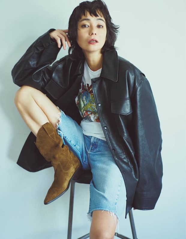フィールドジャケットM-65のデザインをベースにキレイめに仕上げたレザージャケットには、今季らしいデニムのハーフパンツをコーディネート。大人のやんちゃ感が◎。ジャケット¥187,000(ロエフ/エイチ ビューティー&ユース)、Tシャツ¥19,800(SEA/エスストア)、デニムハーフパンツ¥45,100(マザー/リトルリーグ インク)、ブーツ¥22,000(ル タロン/ル タロン 有楽町マルイ店)