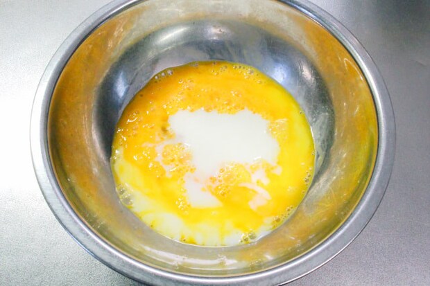 砂糖と牛乳を卵液に混ぜるのは、フレンチトーストを作る時と同じです。