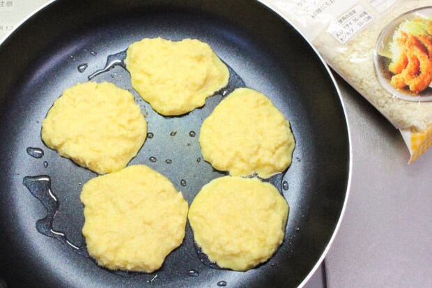 3. フライパンにサラダ油を引いて中火で熱し、生地を小さめに丸く広げ、2分ほど焼きます。