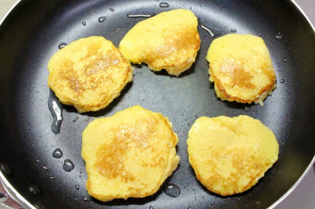 余ったパン粉のリメイク料理「パン粉フレンチトースト」が、こちらです。パン粉で作ったとは思えない、ミニパンケーキ風のおいしそうなおやつに仕上がりました。