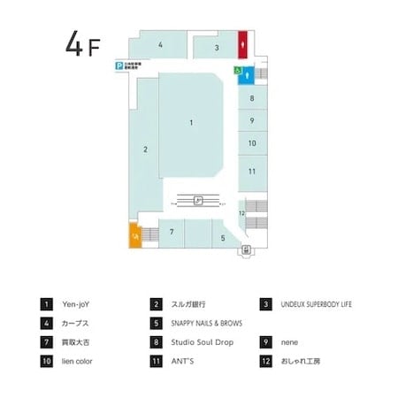 4階は、夜空をイメージしたカラーで彩る、暮らしのサポートフロアになっている。100円ショップ「Yen-joY」や「スルガ銀行」をはじめ、美容・フィットネスなど、日常生活を支えるサービス系店舗が並ぶ。