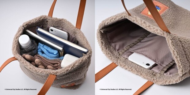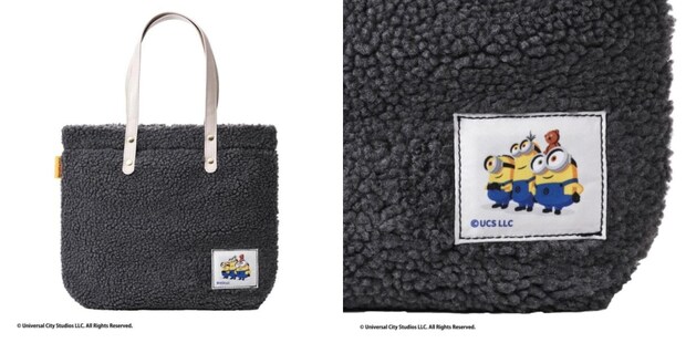 ふわふわのボア素材を使い、かわいらしいミニオンのワッペンをあしらったトートバッグ。カラーは「グレー」「ブラウン」の2種類から選べる。バッグの大きさは、幅約29cm×高さ38cm×マチ7.5cm(持ち手を含む)。