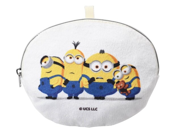ミニオンたちをデザインした丸型ポーチ。「ティム」を大切に抱える「ボブ」など、密着する4人の姿を描いた。化粧品や文房具などの小物収納におすすめだという。ポーチの大きさは、幅約15cm×高さ約12cm。