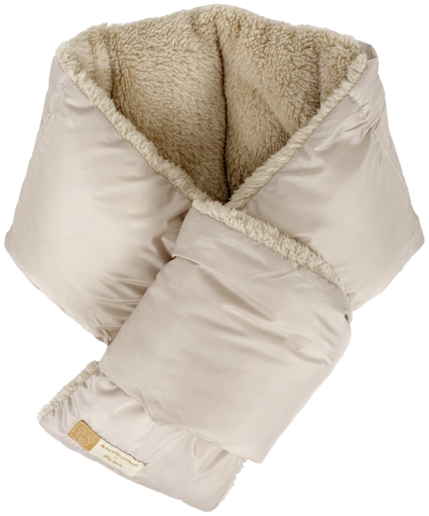 ふわふわのボア素材とキルティング生地を組み合わせた中綿マフラー。ナチュラルなカラーで、福袋限定の「くまのがっこう」のコラボタグ付き。