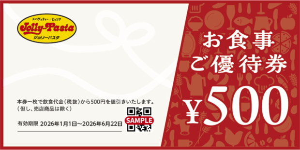全国のジョリーパスタで使える食事券500円分の8枚セット。1枚で飲食代金(税抜)から500円値引きでき、1回の食事で複数枚を使用できる。売店商品は対象外。