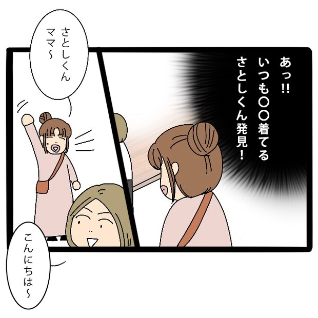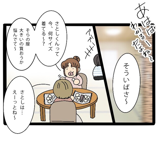 「そういえばさ~さとしくんって今、何サイズ着てる?そらの服大きいの買おうか悩んでて~」私はさとしくんが着ている服をチェックするため、そらの服のサイズに悩んでいるふりをします。「さとしは・・・えーっとね」さとしくんママは首をかしげながら、なんだっけな~と考え込んでいる様子。