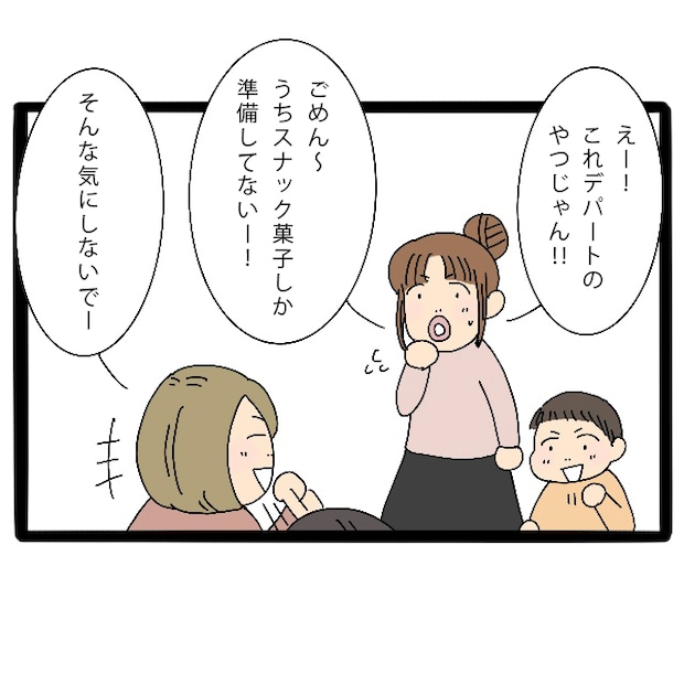 「えー!これデパートのやつじゃん!ごめん~うちスナック菓子しか準備してない!」さすがさとしくんママ。子どもにブランド物の服を着せるだけあって手土産も豪華。これはおさがりも期待できるかも・・・私は密かに胸を躍らせます。