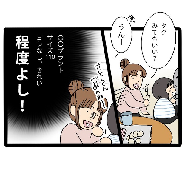 ちまちま節約するよりも、もらったおさがりをフリマアプリで売れば、もっと楽にお金を浮かせられることに気付いたルミ子さん。そうと決まれば即行動。いつもブランド物の服を着ているさとしくんママに声をかけ、家に招きました。ルミ子さんは、息子そらくんの服のサイズに悩んでいるふりをして、さとしくんが着ている服のタグをチェックします。目をつけていた通りの有名ブランド、ヨレも汚れもない・・・程度よし!このレベルを普段から着てるなら、おさがりの質も期待できる。ルミ子さんは心を躍らせました。人からもらったおさがりを許可なく売って大丈夫なのでしょうか。譲った人が見たらきっとモヤモヤすると思います。